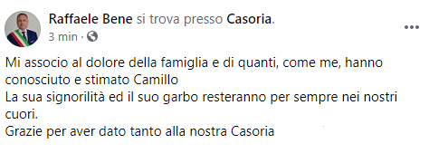 Questa parte del post pubblicato sulla sua pagina Facebook dal Sindaco di Casoria Raffaele Bene: "Mi associo al dolore della famiglia e di quanti - si legge nel post - come me, hanno conosciuto e stimato Camillo (...). La sua signorilità ed il suo garbo resteranno per sempre nei nostri cuori. Grazie - conclude il post - per aver dato tanto alla nostra Casoria (...)".
