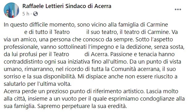 "In questo difficile momento, sono vicino alla famiglia di Carmine ... e di tutto il Teatro ... il suo teatro, il teatro di Carmine. Va via un amico, una persona che conosco da sempre. Sotto l’aspetto professionale, vanno sottolineati- si legge nella nota- l’impegno e la dedizione, senza sosta, da lui profusi per il Teatro ... di Acerra. Passione e tenacia hanno contraddistinto ogni sua iniziativa fino all'ultimo. Da un punto di vista umano, rimarranno, nel ricordo di tutta la Comunità acerrana, il suo sorriso e la sua disponibilità. Mi dispiace anche non essere riuscito a salutarlo per l’ultima volta. Acerra- si legge nella nota- perde un prezioso punto di riferimento artistico. Lascia molto alla città, insieme a un vuoto per il quale esprimiamo condoglianze alla sua famiglia. Sapremo perpetuare la sua eredità."