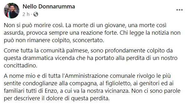 "Non si può morire così. La morte di un giovane, una morte così assurda, provoca sempre una reazione forte. -Si legge nella nota- Chi legge la notizia non può non rimanere colpito, sconcertato. Come tutta la comunità palmese, sono profondamente colpito da questa drammatica vicenda che ha portato alla perdita di un nostro concittadino. A nome mio e di tutta l’Amministrazione comunale rivolgo le più sentite condoglianze alla compagna, al figlioletto, ai genitori ed ai familiari tutti di Enzo, a cui va la nostra vicinanza. -Si legge nella nota- Non ci sono parole per descrivere il dolore di questa perdita."
