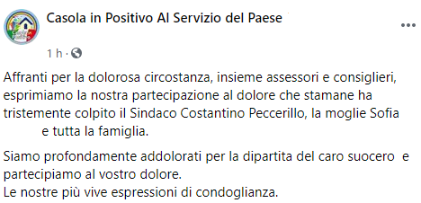 Questo parte del post pubblicato sulla pagina Facebook 'Casola in Positivo al servizio del Paese': "Affranti per la dolorosa circostanza, insieme assessori e consiglieri, esprimiamo la nostra partecipazione al dolore che stamane ha tristemente colpito il Sindaco - si legge nel post - Costantino Peccerillo, la moglie Sofia (...) e tutta la famiglia. Siamo profondamente addolorati per la dipartita del caro suocero e partecipiamo al vostro dolore. Le nostre più vive - conclude il post - espressioni di condoglianza". Le più sentite condoglianze anche da parte della redazione di GoldwebTv.
