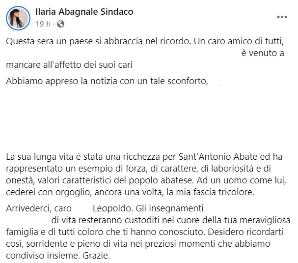 "Questa sera un paese si abbraccia nel ricordo. Un caro amico di tutti, ... è venuto a mancare all’affetto dei suoi cari ... Abbiamo appreso la notizia con un tale sconforto, ... La sua lunga vita è stata una ricchezza per Sant'Antonio Abate ed ha rappresentato- si legge nella nota- un esempio di forza, di carattere, di laboriosità e di onestà, valori caratteristici del popolo abatese. Ad un uomo come lui, cederei con orgoglio, ancora una volta, la mia fascia tricolore. Arrivederci, caro ... Leopoldo. Gli insegnamenti ... di vita resteranno custoditi- si legge nella nota- nel cuore della tua meravigliosa famiglia e di tutti coloro che ti hanno conosciuto. Desidero ricordarti così, sorridente e pieno di vita nei preziosi momenti che abbiamo condiviso insieme. Grazie."