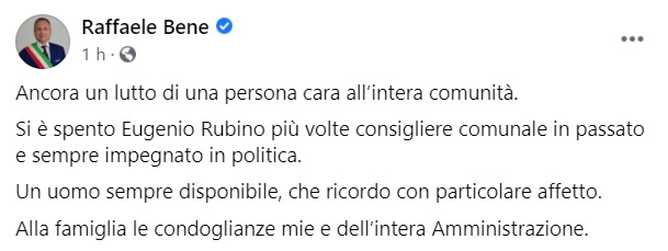 "Ancora un lutto di una persona cara all’intera comunità. Si è spento Eugenio Rubino più volte consigliere comunale in passato e- si legge nella nota- sempre impegnato in politica. Un uomo sempre disponibile, che ricordo con particolare affetto. Alla famiglia le condoglianze mie e dell’intera Amministrazione."