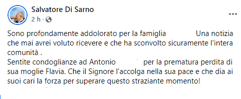 Questo il post pubblicato dal Sindaco di Somma Vesuviana Salvatore Di Sarno sulla sua pagina Facebook: "Sono profondamente addolorato per la famiglia (...) Una notizia che mai avrei voluto ricevere e che - si legge nel post - ha sconvolto sicuramente l'intera comunità. Sentite condoglianze ad Antonio (...) per la prematura perdita di sua moglie Flavia. Che il Signore l'accolga nella sua pace e che dia ai suoi cari - conclude il post - la forza per superare questo straziante momento(...)".