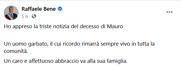 Questo il post pubblicato sulla pagina Facebook di Raffaele Bene, sindaco di Casoria: "Ho appreso la triste notizia del decesso di Mauro (...). Un uomo garbato- si legge - il cui ricordo rimarrà sempre vivo in tutta la comunità. Un caro e affettuoso abbraccio va alla sua famiglia".