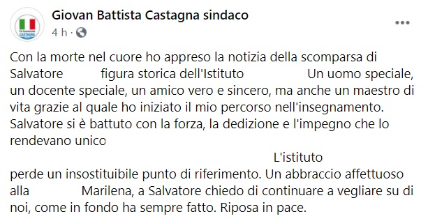 "Con la morte nel cuore ho appreso la notizia della scomparsa di Salvatore ..., figura storica dell'Istituto ... Un uomo speciale, un docente speciale, un amico vero e sincero, ma anche un maestro di vita grazie al quale ho iniziato il mio percorso nell'insegnamento. Salvatore- si legge nella nota- si è battuto con la forza, la dedizione e l'impegno che lo rendevano unico ... L'istituto ... perde un insostituibile punto di riferimento. Un abbraccio affettuoso alla ... Marilena, a Salvatore chiedo di continuare a vegliare su di noi, come in fondo ha sempre fatto. Riposa in pace."
