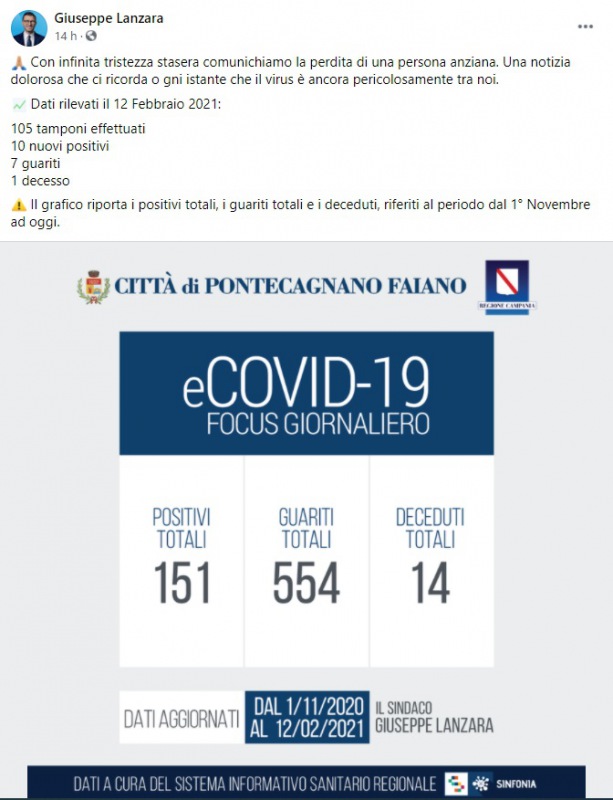 "Con infinita tristezza stasera comunichiamo la perdita di una persona anziana. Una notizia dolorosa che ci ricorda o gni istante che il virus è ancora pericolosamente tra noi. Dati rilevati il 12 Febbraio 2021: 105 tamponi effettuati, 10 nuovi positivi, 7 guariti, 1 decesso. Il grafico- si legge nella nota- riporta i positivi totali, i guariti totali e i deceduti, riferiti al periodo dal 1° Novembre ad oggi."