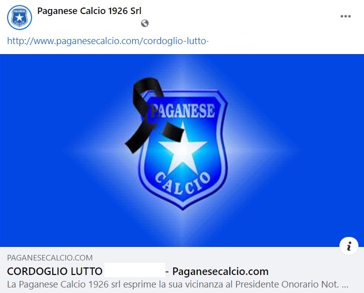 "La Paganese Calcio 1926 srl esprime la sua vicinanza al Presidente Onorario Not. Aniello ...e alla sua famiglia per la perdita del caro suocero. Il Presidente Raffaele Trapani, l’Amministratore Unico Filippo Raiola, e tutta la famiglia azzurrostellata porgono le più sentite condoglianze a lui e i suoi cari in questo giorno triste."