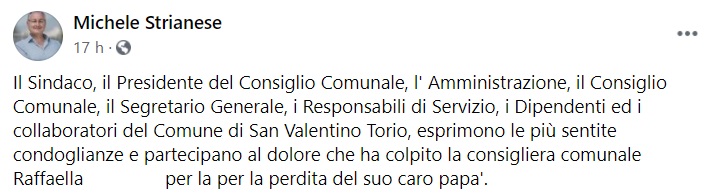 "Il Sindaco, il Presidente del Consiglio Comunale, l' Amministrazione, il Consiglio Comunale, il Segretario Generale, i Responsabili di Servizio, i Dipendenti ed i collaboratori del Comune di San Valentino Torio, esprimono le più sentite condoglianze e partecipano al dolore- si legge nella nota- che ha colpito la consigliera comunale Raffaella ... per la per la perdita del suo caro papa'."