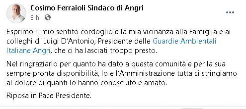 "Esprimo il mio sentito cordoglio e la mia vicinanza alla Famiglia e ai colleghi di Luigi D’Antonio, Presidente delle Guardie Ambientali Italiane Angri, che ci ha lasciati troppo presto. Nel ringraziarlo per quanto ha dato a questa comunità e per la sua sempre pronta disponibilità, Io e l’Amministrazione tutta ci stringiamo al dolore di quanti lo hanno conosciuto e amato. Riposa in Pace Presidente."
