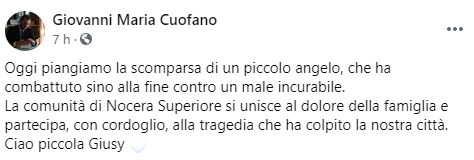 Questo il post pubblicato sulla sua pagina Facebook dal Sindaco di Nocera Superiore Giovanni Maria Cuofano: "Oggi piangiamo la scomparsa di un piccolo angelo, che ha combattuto sino alla fine contro un male incurabile. La comunità di Nocera Superiore - si legge nel post - si unisce al dolore della famiglia e partecipa, con cordoglio, alla tragedia che ha colpito la nostra città. Ciao piccola Giusy"