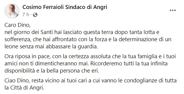 "Caro Dino, nel giorno dei Santi hai lasciato questa terra dopo tanta lotta e sofferenza, che hai affrontato con la forza e la determinazione di un leone senza mai abbassare la guardia. Ora riposa in pace, con la certezza assoluta che la tua famiglia e i tuoi amici non ti dimenticheranno mai. -Si legge nella nota- Ricorderemo tutti la tua infinita disponibilità e la bella persona che eri. Ciao Dino, resta vicino ai tuoi cari a cui vanno le condoglianze di tutta la Città di Angri."