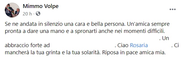 "Se ne andata in silenzio una cara e bella persona. Un'amica sempre pronta a dare una mano e a spronarti anche nei momenti difficili. -Si legge nella nota- ... Un abbraccio forte ad ... Ciao Rosaria ... Ci mancherà la tua grinta e la tua solarità. Riposa in pace amica mia."