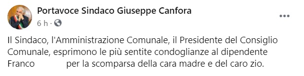 "Il Sindaco, l'Amministrazione Comunale, il Presidente del Consiglio Comunale, esprimono le più sentite condoglianze al dipendente Franco ... per la scomparsa della cara madre e del caro zio."