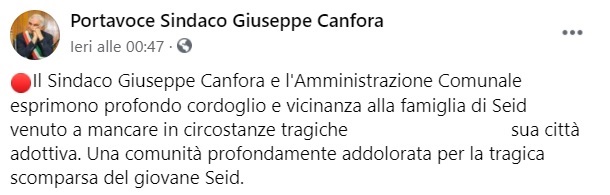 "Il Sindaco Giuseppe Canfora e l'Amministrazione Comunale esprimono profondo cordoglio e vicinanza alla famiglia di Seid ... venuto a mancare in circostanze tragiche ... sua città adottiva. Una comunità- si legge nella nota- profondamente addolorata per la tragica scomparsa del giovane Seid."