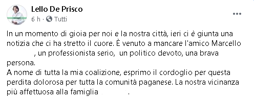 Lo apprendiamo dalla pagina Facebook del Sindaco di Pagani, Lello De Prisco.