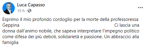 Questo parte del post pubblicato sulla sua pagina Facebook dal Sindaco di Ottaviano Luca Capasso: "Esprimo il mio profondo cordoglio per la morte della professoressa Geppina (...). Ci lascia - si legge nel post - una donna dall'animo nobile, che sapeva interpretare l'impegno politico come difesa dei più deboli, solidarietà e passione. Un abbraccio alla famiglia".