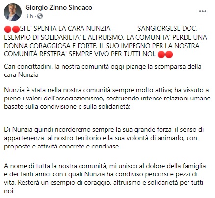 Questo il messaggio di cordoglio che apprendiamo dalla pagina fcabeook del Sindaco Zinno, di San Giorgio a Cremano: "SI E' SPENTA LA CARA NUNZIA ..., SANGIORGESE DOC, ESEMPIO DI SOLIDARIETA' E ALTRUISMO. LA COMUNITA' PERDE UNA DONNA CORAGGIOSA E FORTE. IL SUO IMPEGNO PER LA NOSTRA COMUNITÀ RESTERA' SEMPRE VIVO PER TUTTI NOI. Cari concittadini, la nostra comunità oggi piange la scomparsa della cara Nunzia ... Nunzia è stata nella nostra comunità sempre molto attiva; ha vissuto a pieno i valori dell’associazionismo, costruendo intense relazioni umane basate sulla condivisione e sulla solidarietà; ... Di Nunzia quindi ricorderemo sempre la sua grande forza, il senso di appartenenza al nostro territorio e la sua volontà di animarlo, con proposte e attività concrete e condivise. ... A nome di tutta la nostra comunità, mi unisco al dolore della famiglia e dei tanti amici con i quali Nunzia ha condiviso percorsi e pezzi di vita. Resterà un esempio di coraggio, altruismo e solidarietà per tutti noi"