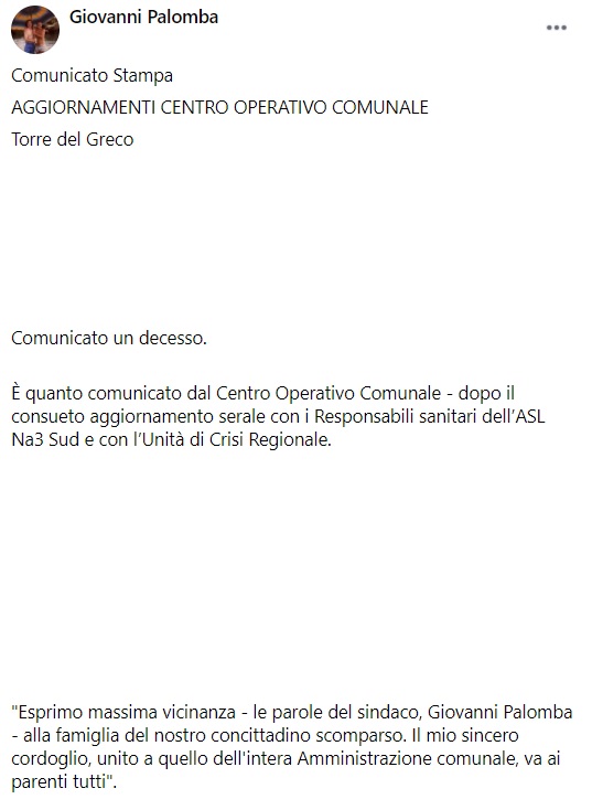 Questo parte di quanto apprendiamo dal profilo facebook del Sindaco di Torre del Greco, Palomba: