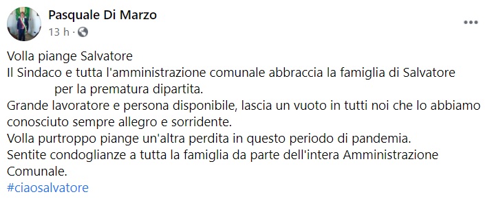 "Volla piange Salvatore .... Il Sindaco e tutta l'amministrazione comunale abbraccia la famiglia di Salvatore ... per la prematura dipartita. Grande lavoratore e persona disponibile, lascia un vuoto- si legge nella nota- in tutti noi che lo abbiamo conosciuto sempre allegro e sorridente. Volla purtroppo piange un'altra perdita in questo periodo di pandemia. Sentite condoglianze a tutta la famiglia da parte dell'intera Amministrazione Comunale. #ciaosalvatore"