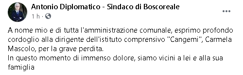 "A nome mio e di tutta l'amministrazione comunale, esprimo profondo cordoglio alla dirigente dell'istituto comprensivo "Cangemi", Carmela Mascolo, per la grave perdita. In questo momento di immenso dolore, siamo vicini a lei e alla sua famiglia".