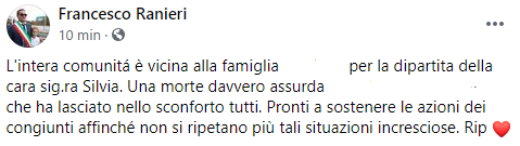 Questo parte del post pubblicato dal Sindaco di Terzigno Francesco Ranieri: "L'intera comunitá è vicina alla famiglia (...) per la dipartita della cara sig.ra Silvia. Una morte davvero assurda (...) che ha lasciato nello sconforto tutti. Pronti a sostenere le azioni dei congiunti affinché non si ripetano più tali situazioni incresciose. Rip".