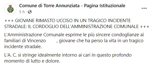 "L’Amministrazione Comunale esprime le più sincere condoglianze ai familiari di Vincenzo ... , giovane che ha perso la vita in un tragico incidente stradale. -Si legge nella nota- L’A. C. si stringe idealmente intorno ai cari in questo profondo momento di lutto e dolore."