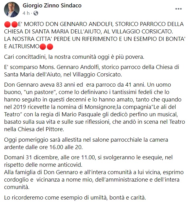 Questo quanto apprendiamo dalla pagina facebook del Sindaco Zinno: