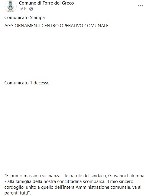 "AGGIORNAMENTI CENTRO OPERATIVO COMUNALE... Comunicato 1 decesso... "Esprimo massima vicinanza - le parole del sindaco, Giovanni Palomba - alla famiglia della nostra concittadina scomparsa. Il mio sincero cordoglio, unito a quello dell'intera Amministrazione comunale, va ai parenti tutti"."