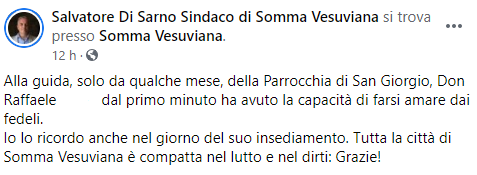 Questo parte del post pubblicato sulla sua pagina Facebook dal Sindaco di Somma Vesuviana Salvatore Di Sarno: "Alla guida, solo da qualche mese, della Parrocchia di San Giorgio, Don Raffaele (...), dal primo minuto - si legge nel post - ha avuto la capacità di farsi amare dai fedeli. Io lo ricordo anche nel giorno del suo insediamento. Tutta la città - conclude il post - di Somma Vesuviana è compatta nel lutto e nel dirti: Grazie!".