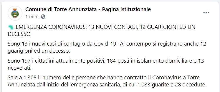 Questo quanto pubblicato sulla pagina facebook del Comune di Torre Annunziata
