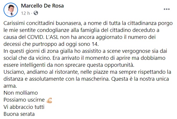 "Carissimi concittadini buonasera, a nome di tutta la cittadinanza porgo le mie sentite condoglianze alla famiglia del cittadino deceduto a causa del COVID. L’ASL non ha ancora aggiornato il numero dei decessi che purtroppo ad oggi sono 14. In questi giorni di zona gialla- si legge nella nota- ho assistito a scene vergognose sia dai social che da vicino. Era arrivato il momento di aprire ma dobbiamo essere intelligenti da non sprecare questa opportunità. Usciamo, andiamo al ristorante, nelle piazze ma sempre rispettando la distanza e assolutamente con la mascherina. Questa- si legge nella nota- è la nostra unica arma. Non molliamo Possiamo uscirne. Vi abbraccio tutti. Buona serata"