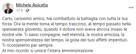 Questo il post pubblicato sulla sua pagina Facebook dal Sindaco di Trentola Ducenta Michele Apicella: "Carlo, carissimo amico, hai combattuto la battaglia con tutta la tua forza. Ora la mente torna al tempo trascorso, al tempo passato nella spensierata gioventù, quando il dolore non aveva ancora invaso le nostre vite. Ti siano compagne - si legge nel post - nell’eternità, la nostra amicizia, la nostra spensieratezza del tempo, la gioia dei tuoi affetti imperituri. Ti ricorderemo per sempre. Al mio ricordo - conclude il post - si unisce l'intera amministrazione".
