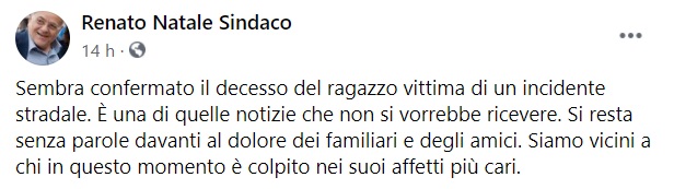 "Sembra confermato il decesso del ragazzo vittima di un incidente stradale. È una di quelle notizie che non si vorrebbe ricevere. -Si legge nella nota- Si resta senza parole davanti al dolore dei familiari e degli amici. Siamo vicini a chi in questo momento è colpito nei suoi affetti più cari."