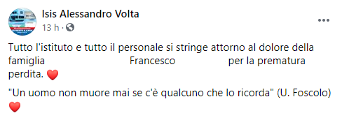 Questo parte del post pubblicato sulla pagina Facebook dell'Isis Alessandro Volta di Aversa: "Tutto l'istituto e tutto il personale si stringe attorno al dolore della famiglia di (...) Francesco (...) per la prematura perdita. "Un uomo non muore mai se c'è qualcuno che lo ricorda" (U. Foscolo)".