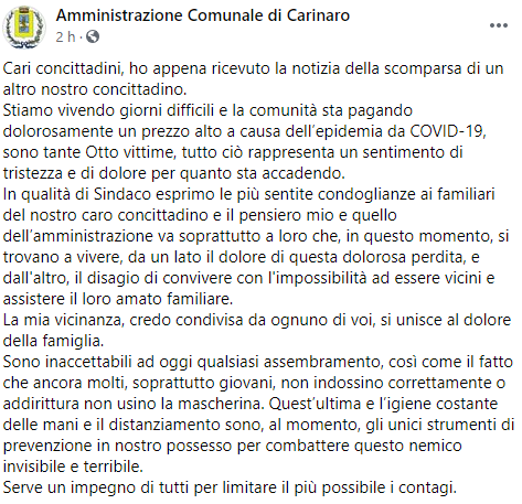 Questo il post pubblicato sulla pagina Facebook 'Amministrazione comunale di Carinaro': "Cari concittadini, ho appena ricevuto la notizia della scomparsa di un altro nostro concittadino. Stiamo vivendo giorni difficili - si legge nel post - e la comunità sta pagando dolorosamente un prezzo alto a causa dell’epidemia da COVID-19, sono tante Otto vittime, tutto ciò rappresenta un sentimento di tristezza e di dolore per quanto sta accadendo. In qualità di Sindaco esprimo le più sentite condoglianze ai familiari del nostro caro concittadino e il pensiero mio e quello dell’amministrazione va soprattutto - prosegue il post - a loro che, in questo momento, si trovano a vivere, da un lato il dolore di questa dolorosa perdita, e dall'altro, il disagio di convivere con l'impossibilità ad essere vicini e assistere il loro amato familiare. La mia vicinanza, credo condivisa da ognuno di voi, si unisce al dolore della famiglia. Sono inaccettabili ad oggi qualsiasi assembramento, così come il fatto che ancora molti - si legge ancora nel post - soprattutto giovani, non indossino correttamente o addirittura non usino la mascherina. Quest’ultima e l’igiene costante delle mani e il distanziamento sono, al momento, gli unici strumenti di prevenzione in nostro possesso per combattere questo nemico invisibile e terribile. Serve un impegno di tutti - conclude il post - per limitare il più possibile i contagi".