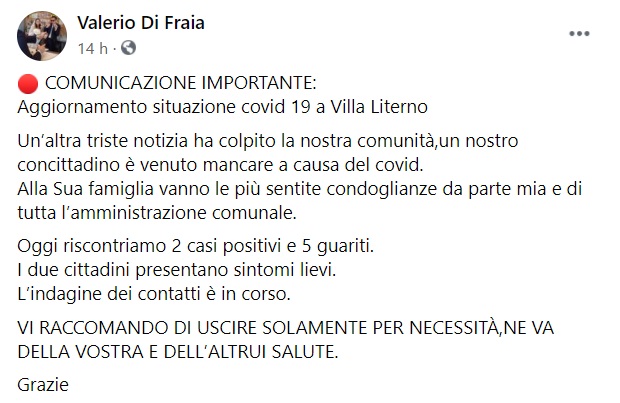 "COMUNICAZIONE IMPORTANTE: Aggiornamento situazione covid 19 a Villa Literno Un’altra triste notizia ha colpito la nostra comunità,un nostro concittadino è venuto mancare a causa del covid. Alla Sua famiglia vanno le più sentite condoglianze da parte mia e di tutta l’amministrazione comunale. -Si legge nella nota- Oggi riscontriamo 2 casi positivi e 5 guariti. I due cittadini presentano sintomi lievi. L’indagine dei contatti è in corso. VI RACCOMANDO DI USCIRE SOLAMENTE PER NECESSITÀ,NE VA DELLA VOSTRA E DELL’ALTRUI SALUTE. Grazie"