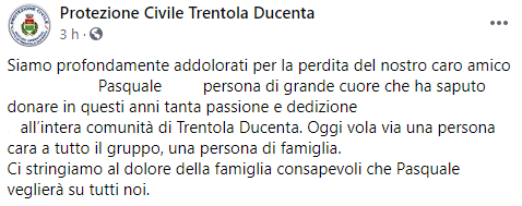 Questo parte del post pubblicato sulla pagina Facebook 'Protezione Civile Trentola Ducenta': "Siamo profondamente addolorati per la perdita del nostro caro amico (...) Pasquale (...), persona - si legge nel post - di grande cuore che ha saputo donare in questi anni tanta passione e dedizione (...) all’intera comunità di Trentola Ducenta. Oggi vola via una persona cara a tutto il gruppo, una persona di famiglia. Ci stringiamo al dolore della famiglia - conclude il post - consapevoli che Pasquale veglierà su tutti noi".