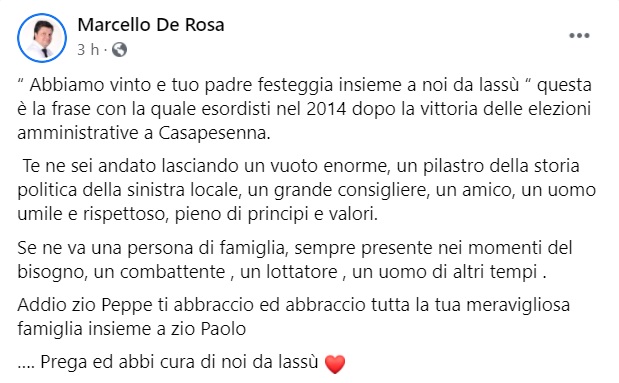 '"Abbiamo vinto e tuo padre festeggia insieme a noi da lassù" questa è la frase con la quale esordisti nel 2014 dopo la vittoria delle elezioni amministrative a Casapesenna. Te ne sei andato lasciando un vuoto enorme, un pilastro della storia politica della sinistra locale, un grande consigliere, un amico, un uomo umile e rispettoso, pieno di principi e valori. Se ne va una persona di famiglia, sempre presente nei momenti del bisogno, un combattente , un lottatore , un uomo di altri tempi . Addio zio Peppe ti abbraccio ed abbraccio tutta la tua meravigliosa famiglia insieme a zio Paolo …. Prega ed abbi cura di noi da lassù'