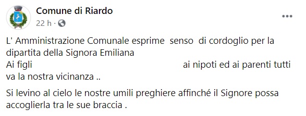 "L'Amministrazione Comunale esprime senso di cordoglio per la dipartita della Signora Emiliana ... Ai figli ... ai nipoti ed ai parenti tutti- si legge nella nota- va la nostra vicinanza .. Si levino al cielo le nostre umili preghiere affinché il Signore possa accoglierla tra le sue braccia."