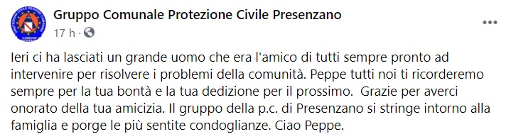 "Ieri ci ha lasciati un grande uomo che era l'amico di tutti sempre pronto ad intervenire per risolvere i problemi della comunità. Peppe tutti noi ti ricorderemo sempre per la tua bontà e la tua dedizione per il prossimo. -Si legge nella nota- Grazie per averci onorato della tua amicizia. Il gruppo della p.c. di Presenzano si stringe intorno alla famiglia e porge le più sentite condoglianze. Ciao Peppe."