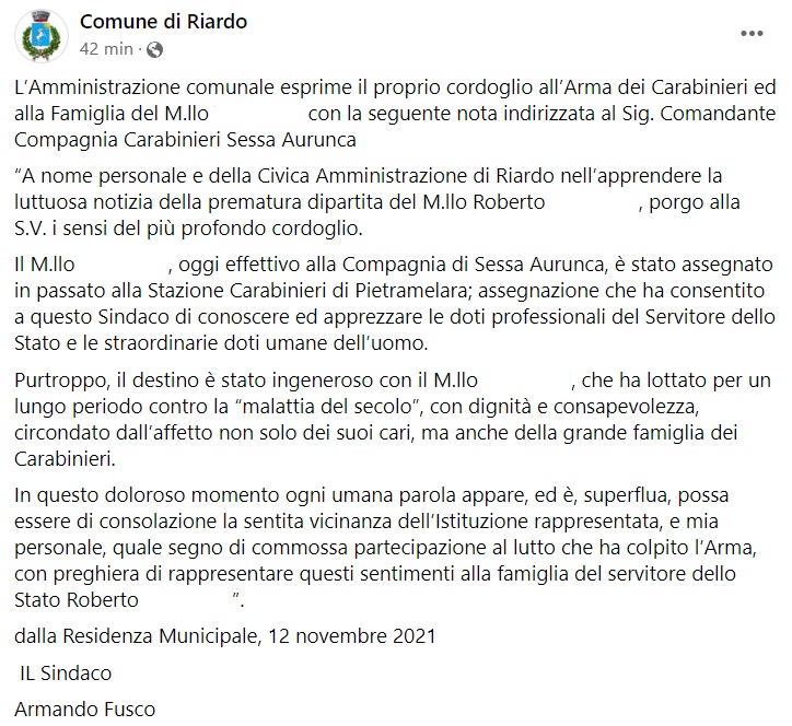 "L’Amministrazione comunale esprime il proprio cordoglio all’Arma dei Carabinieri ed alla Famiglia del M.llo ... con la seguente nota indirizzata al Sig. Comandante Compagnia Carabinieri Sessa Aurunca “A nome personale e della Civica Amministrazione di Riardo nell’apprendere la luttuosa notizia della prematura dipartita del M.llo Roberto ... , porgo alla S.V. i sensi del più profondo cordoglio. -Si legge nella nota- Il M.llo ... , oggi effettivo alla Compagnia di Sessa Aurunca, è stato assegnato in passato alla Stazione Carabinieri di Pietramelara ; assegnazione che ha consentito a questo Sindaco di conoscere ed apprezzare le doti professionali del Servitore dello Stato e le straordinarie doti umane dell’uomo. Purtroppo, il destino è stato ingeneroso con il M.llo ... , che ha lottato per un lungo periodo contro la “malattia del secolo”, con dignità e consapevolezza, circondato dall’affetto non solo dei suoi cari, ma anche della grande famiglia dei Carabinieri. -Si legge nella nota- In questo doloroso momento ogni umana parola appare, ed è, superflua, possa essere di consolazione la sentita vicinanza dell’Istituzione rappresentata, e mia personale, quale segno di commossa partecipazione al lutto che ha colpito l’Arma, con preghiera di rappresentare questi sentimenti alla famiglia del servitore dello Stato Roberto ... ”. dalla Residenza Municipale, 12 novembre 2021 IL Sindaco Armando Fusco"