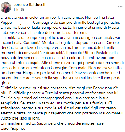 Questo il post pubblicato sulla sua pagina Facebook dal Sindaco di Massa Lubrense Lorenzo Balduccelli: "E’ andato via, in cielo, un amico. Un caro amico. Non ce l’ha fatta Peppe (...). Compagno da sempre di mille battaglie politiche. Un uomo buono, leale, semplice, onesto. Innamoratissimo di Massa Lubrense e con al centro del cuore la sua Termini. Ha militato da sempre - si legge nel post - in politica, una vita in consiglio comunale, vari incarichi alla Comunità Montana. Legato a doppio filo con il Circolo dei Cacciatori dove da sempre era animatore instancabile di mille momenti di convivialità e di socialità. Il piccolo Ufficio Postale nella piazza di Termini era la sua casa e tutti coloro che entravano non erano utenti ma ospiti. Alle ultime elezioni - prosegue il post - già provato da una serie di acciacchi, non era entrato in Consiglio Comunale. Non ne aveva fatto un dramma. Ha gioito per la vittoria perché aveva vinto anche lui ed ha continuato ad essere della squadra senza mai lasciare il campo da gioco. E’ difficile per me, quasi suo coetaneo, dire oggi che Peppe non c’è più. E’ difficile pensare a Termini senza potermi confrontare con lui. Dal cielo guardaci - si legge ancora nel post - ed accompagnaci con il tuo sorriso e la tua semplicità. Sei stato un faro ed una roccia per la tua famiglia. Ci stringiamo intorno a tua moglie ed ai tuoi carissimi figli con tanto affetto e tanta vicinanza pur sapendo che non potremo mai colmare il vuoto che lasci in loro. Ci mancherai molto. Sappi però che ti ricorderemo sempre. Ciao Peppino".