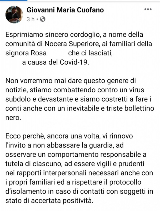 Lo apprendiamo dalla pagina Facebook del Sindaco di Nocera Superiore, Giovanni Maria Cuofano.