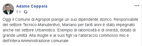 "Oggi il Comune di Agropoli piange un suo dipendente storico. Responsabile del settore Tecnico-Manutentivo, Mariano per tanti anni è stato impegnato anche nel settore Urbanistico. Esempio di laboriosità e di onestà, dotato di grande umiltà. Alla moglie e ai suoi figli va l'abbraccio commosso mio e dell'intera Amministrazione comunale".