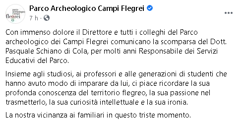 "Con immenso dolore il Direttore e tutti i colleghi del Parco archeologico dei Campi Flegrei comunicano la scomparsa del Dott. Pasquale Schiano di Cola, per molti anni Responsabile dei Servizi Educativi del Parco. Insieme agli studiosi, ai professori e alle generazioni di studenti che hanno avuto modo di imparare da lui, ci piace ricordare la sua profonda conoscenza del territorio flegreo, la sua passione nel trasmetterlo, la sua curiosità intellettuale e la sua ironia. La nostra vicinanza ai familiari in questo triste momento."