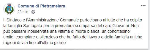 "Il Sindaco e l’Amministrazione Comunale partecipano al lutto che ha colpito la famiglia Santagata per la prematura scomparsa del caro Giovanni. Non può passare inosservata una vittima di morte bianca, un concittadino umile, esemplare e silenzioso che ha fatto del lavoro e della famiglia uniche ragioni di vita fino all’ultimo giorno."