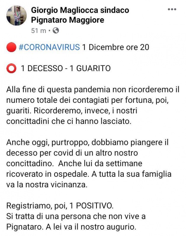 Questo quanto pubblicato sulla pagina facebook del Sindaco di Pignataro Maggiore