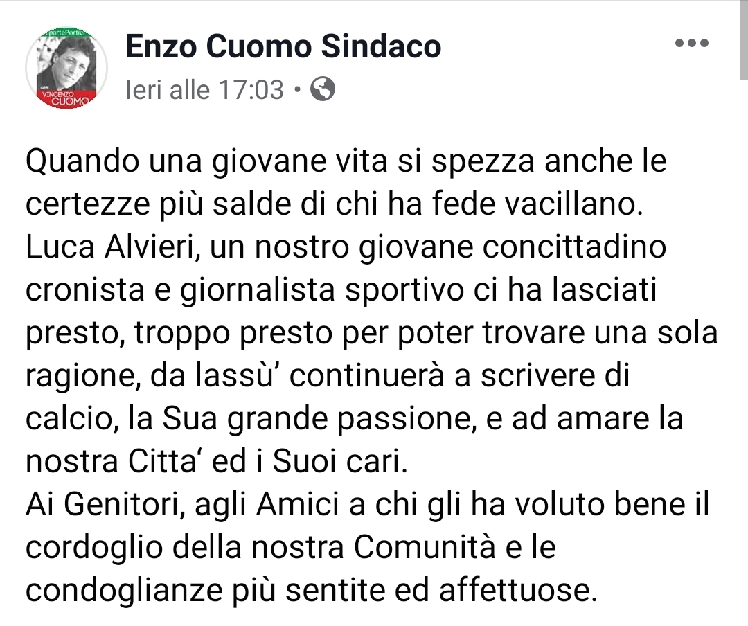 "Quando una giovane vita si spezza anche le certezze più salde di chi ha fede vacillano. Luca Alvieri, un nostro giovane concittadino cronista e giornalista sportivo ci ha lasciati presto, troppo presto per poter trovare una sola ragione, da lassù’ continuerà a scrivere di calcio, la Sua grande passione, e ad amare la nostra Citta‘ ed i Suoi cari. Ai Genitori, agli Amici a chi gli ha voluto bene il cordoglio della nostra Comunità e le condoglianze più sentite ed affettuose."