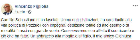"Camillo Sebastiano ci ha lasciati. Uomo delle istituzioni, ha contribuito alla vita politica di Pozzuoli con impegno, dedizione totale ed alto esempio di moralità. Lascia un grande vuoto. Conserveremo con affetto il suo ricordo e ciò che ha fatto. Un abbraccio alla moglie e al figlio, il mio amico Gianluca".