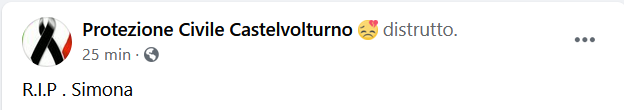 Questo il testo del post della Protezione Civile di Castel Volturno in merito alla scomparsa dell'ottimo avvocato e professionista esemplare dott.ssa Simona: "R.I.P . Simona".